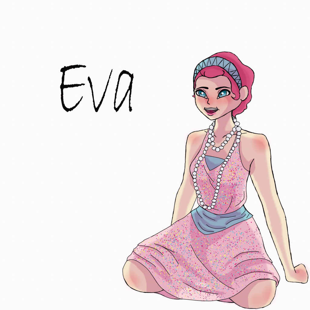 When I first wrote Eva, I struggled most with her morality. In every first draft, she seemed uncaring and crude, more concerned with having a good time than ensuring that mortals live long, happy lives. To be honest, Eva is not easily good. She grew up in a time of pain and hardship, and as a young adult she lived in an era of excess and frivolity. She struggles with selfishness and emotions that flare hot and sudden. Her Aspect form references that with her ever-changing color pallet and hair. But she has a truly loving heart beneath her insane energy, an honest desire to help those in need, born as she saw the world struggle under the weight of war. Her relationship with Azzie mellows her somewhat, reminding her to calm down when her emotions get the better of her. She may have difficulty, sometimes, with understanding the seriousness of her position, but she truly wants to help and protect the mortals she has been entrusted with.