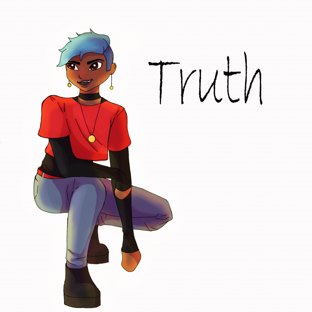 True is, in some ways, a lesson in contrasts. Physically, she is punk inspired, with brightly dyed hair and tattoos that you can’t see in the drawing below (Sorry about that). But ever since her creation, she has been in essence a gentle soul. She is protective, and funny, and independently unique, all wrapped up in a layer of unspoken kindness. She loves the mortals she has been tasked with protecting, despite the pain she has seen as a Native American born in 1794. Make no mistake, she is a warrior – she’s fought more battles, known and unknown, than almost any character in the Marbles duology – but every punch she’s ever thrown has been to protect, rather than to harm. Her alias, the normal Trudy Danton, is proof of that: she works as a fast-food waitress, living in a small downtown apartment, and she spends her days immersing herself in the lives of the mortals. She recognizes that it is her duty to protect them, and she does that by learning about them, by watching their day-to-day routines, by loving them through both their messes and their celebrations. What other way to do that than working as a food service employee?
